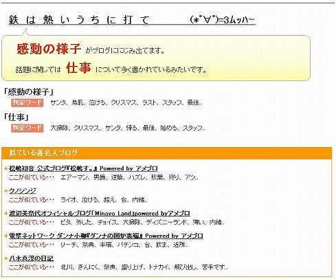 『知らない自分がわかる、あなたのブログを解析します!日々書き綴っているブログ。あなたのブログには実は「どんな話題」が多いのか、そこには「どんな気分」が現れているのか、解析してみませんか?』
