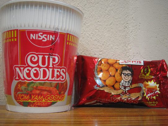 怖くて手がつけられないお菓子とカップラーメン。タイのサガット仏像の前でサガットのまねして写真撮ってる様に、