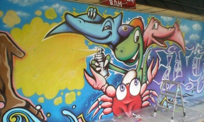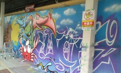 グラフィティ(エアロゾールアート)を壁に書いてるプロペインターがいる。