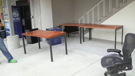 の事務所に設置する机と椅子たちが到着しました。オレが行った時にはすでに荷降ろしも完了してて、顔だけ見に行った感じでした。