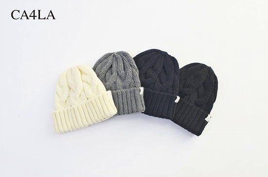 ニットキャップ「× CA4LA / CABLE KNIT CAP 」。