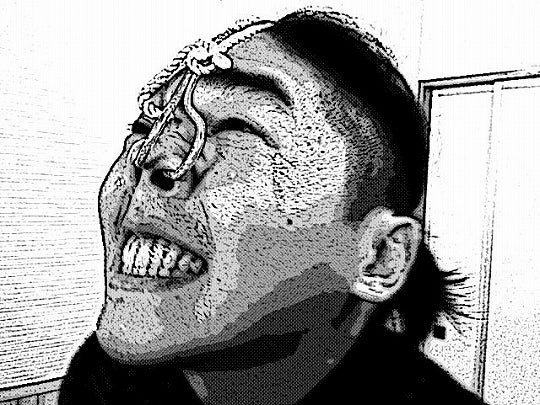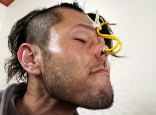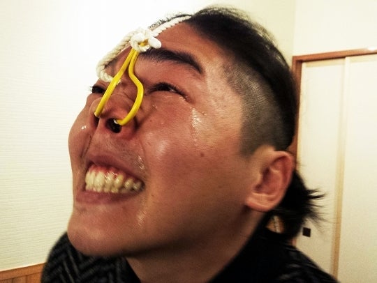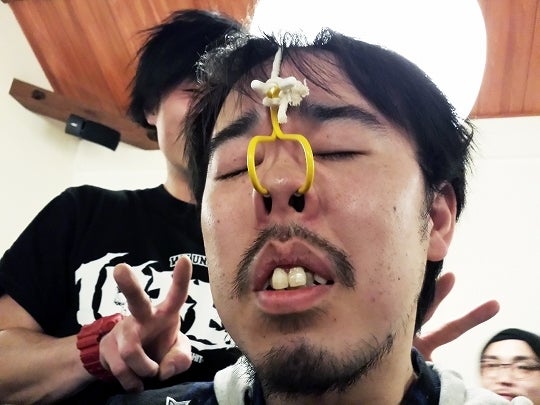 我慢対決で鼻フック、後ろにはペットボトルが詰め込まれていきます。