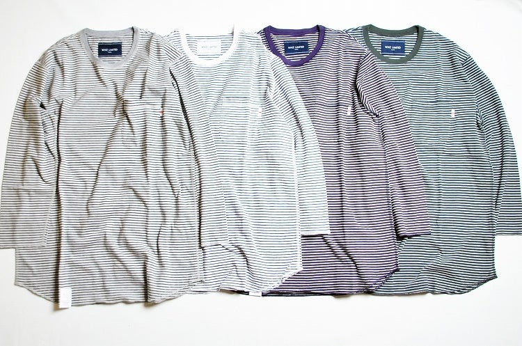 今日再入荷したボーダーのカットソー を中に着たりするとまたオシャレです。
