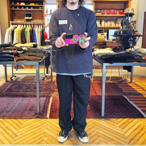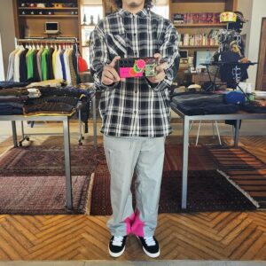 広島産13.5oz.のデニム生地を使用した5ポケットデニムパンツ。全ての縫製糸を橙色で統一させ、身頃全体にユーズド加工を施したデザイン。両腰にL字型ポケット、フロント右にコインポケット、背面左右にパッチポケットを配置。右腰にBLACK AND YELLOWの刻印が入るレザーパッチを叩きつけ。ヒップポケットにはRATSデニムのアイコン、Ratテールのステッチが施された仕様。背面右ポケット左脇にピスネームを挟み込み。腿にゆとりのある、ヒップがコンパクトなストレートシルエット。