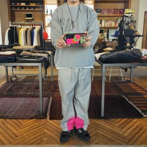 顔料染めのフーディーです。生地は12.5オンスのヘビーウエイトで裏起毛になります。リブは少し固めの仕様です。ポケットとフードはやや大き目で、紐は無しになります。シルエットは身幅が広めで、着丈が短めになっています。フロントにはシルクプリント(水性系ラバー)が入ります。
