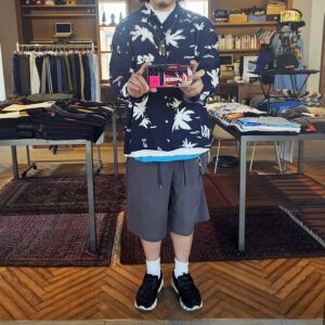 前開き仕様はボタンフライなり、シルエットはルーズフィットで裾幅が広めになっています。