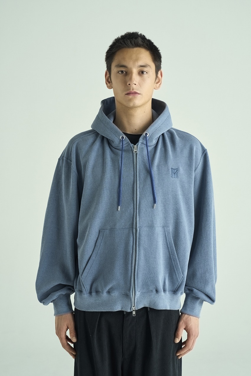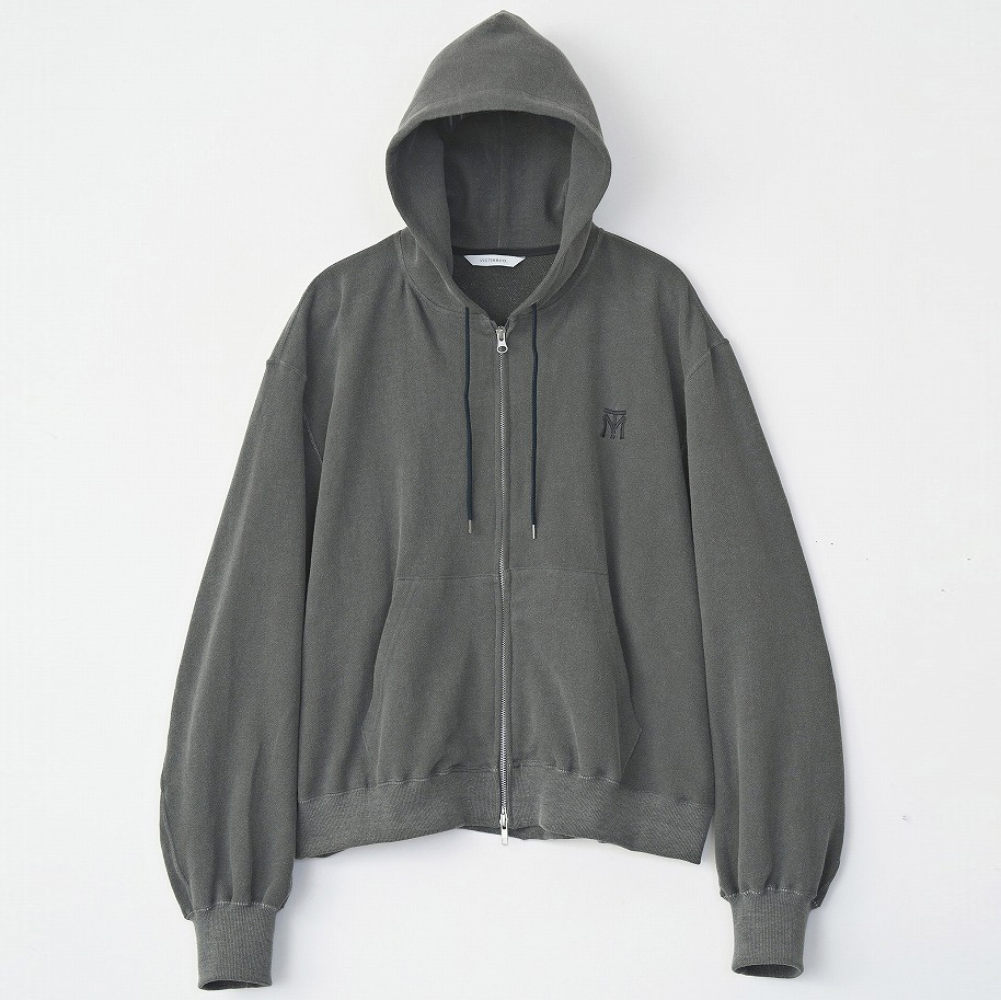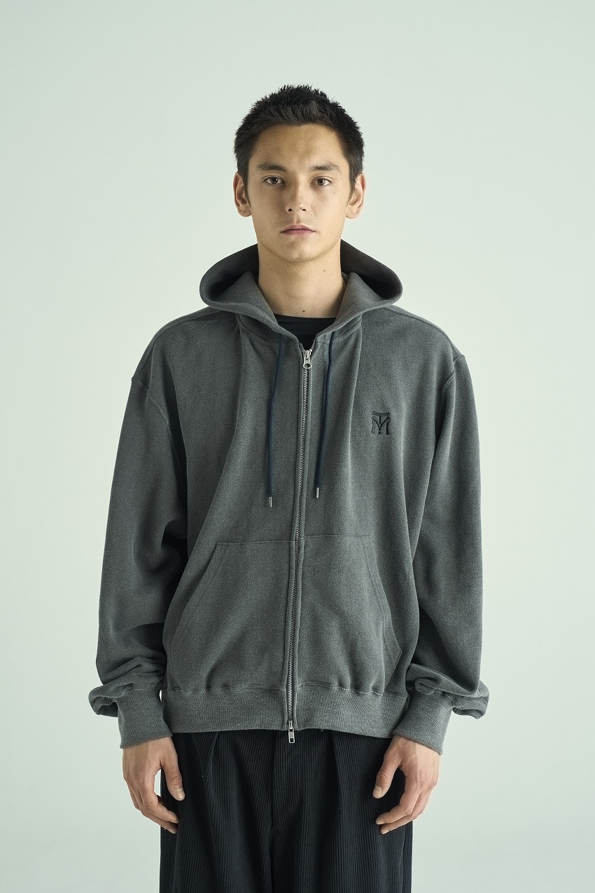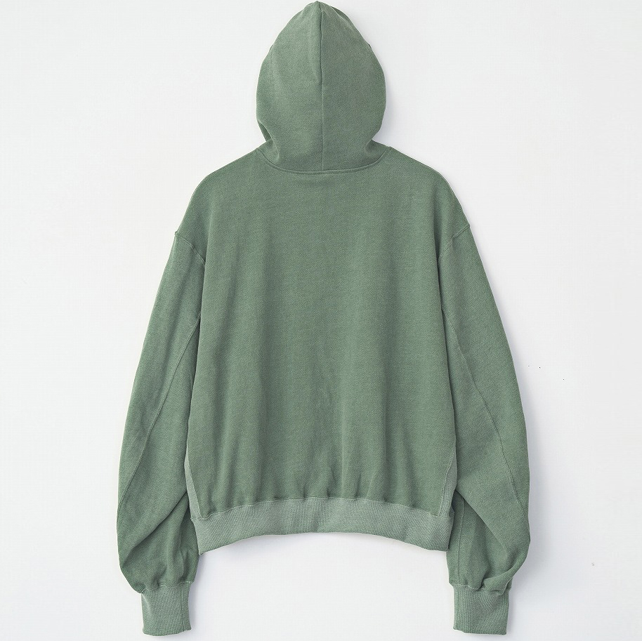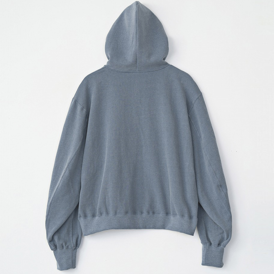 フェード感のある裏毛生地を使用したショート丈パーカー。独特の色落ちと風合いを備えた生地は、着込むほどに表情が増し、ヴィンテージライクな佇まいを演出します。身幅にゆとりを持たせたワイドシルエットを採用しつつ、袖丈をやや長めに、着丈をコンパクトに設計。ボリューム感を保ちながらも全体を軽快に見せ、現代的でバランスの取れたシルエットを実現しています。ウエスト位置が高く見える視覚効果により、スタイルアップ効果も期待できます。フロントは逆開のジップアップ仕様で、カジュアルな日常着としてはもちろん、ミニマルかつ洗練された印象で、シーンやスタイルを問わず汎用性の高い一着です。