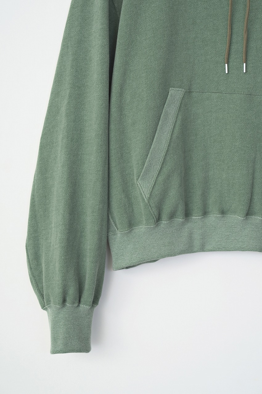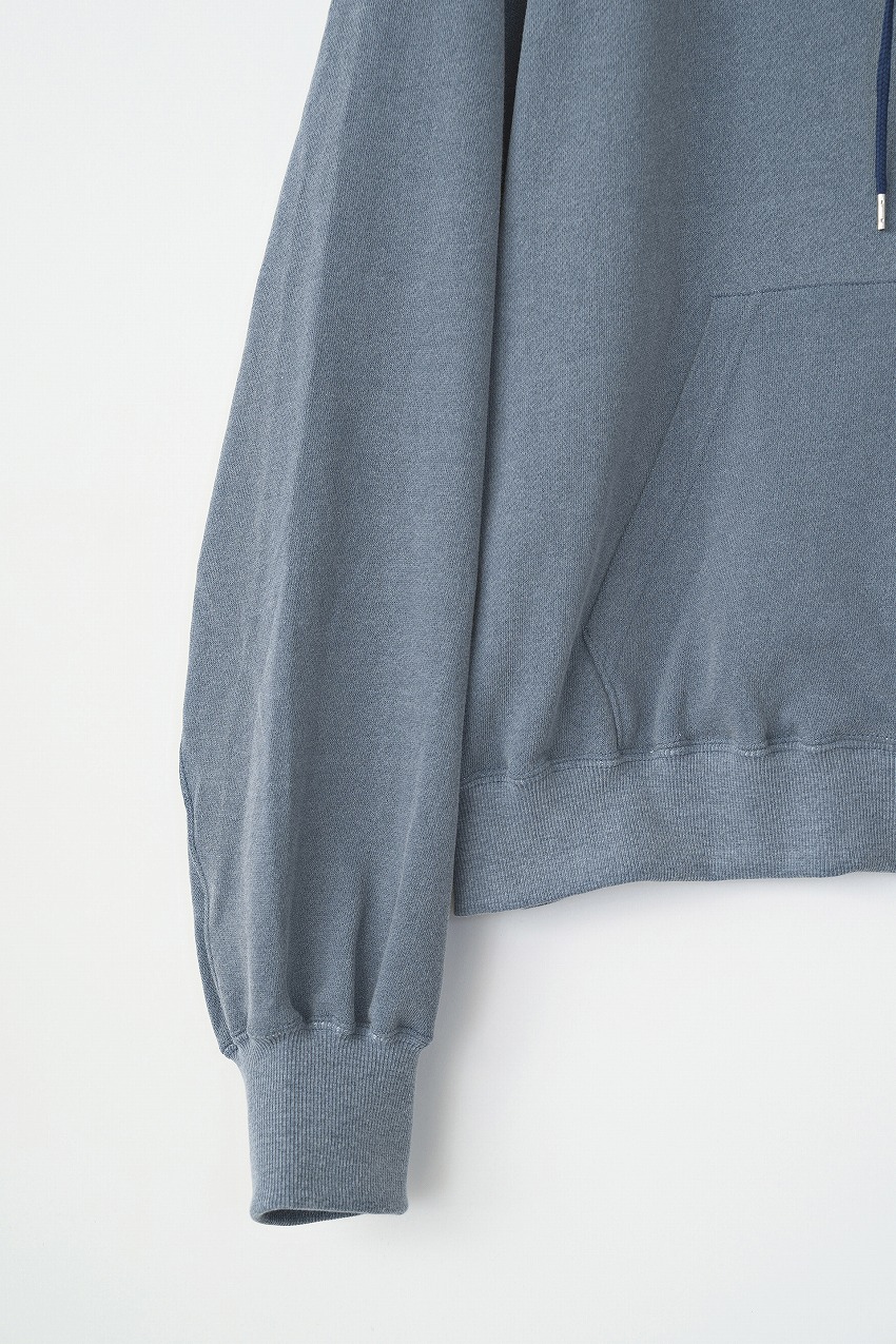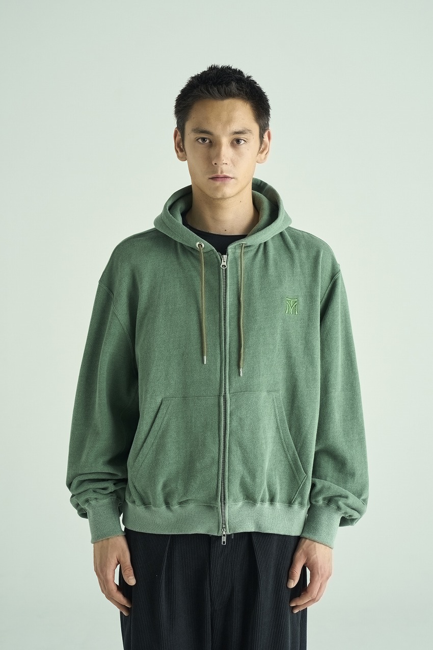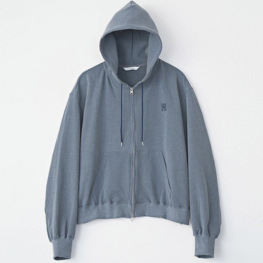 フェード感のある裏毛生地を使用したショート丈パーカー。独特の色落ちと風合いを備えた生地は、着込むほどに表情が増し、ヴィンテージライクな佇まいを演出します。身幅にゆとりを持たせたワイドシルエットを採用しつつ、袖丈をやや長めに、着丈をコンパクトに設計。ボリューム感を保ちながらも全体を軽快に見せ、現代的でバランスの取れたシルエットを実現しています。ウエスト位置が高く見える視覚効果により、スタイルアップ効果も期待できます。フロントは逆開のジップアップ仕様で、カジュアルな日常着としてはもちろん、ミニマルかつ洗練された印象で、シーンやスタイルを問わず汎用性の高い一着です。