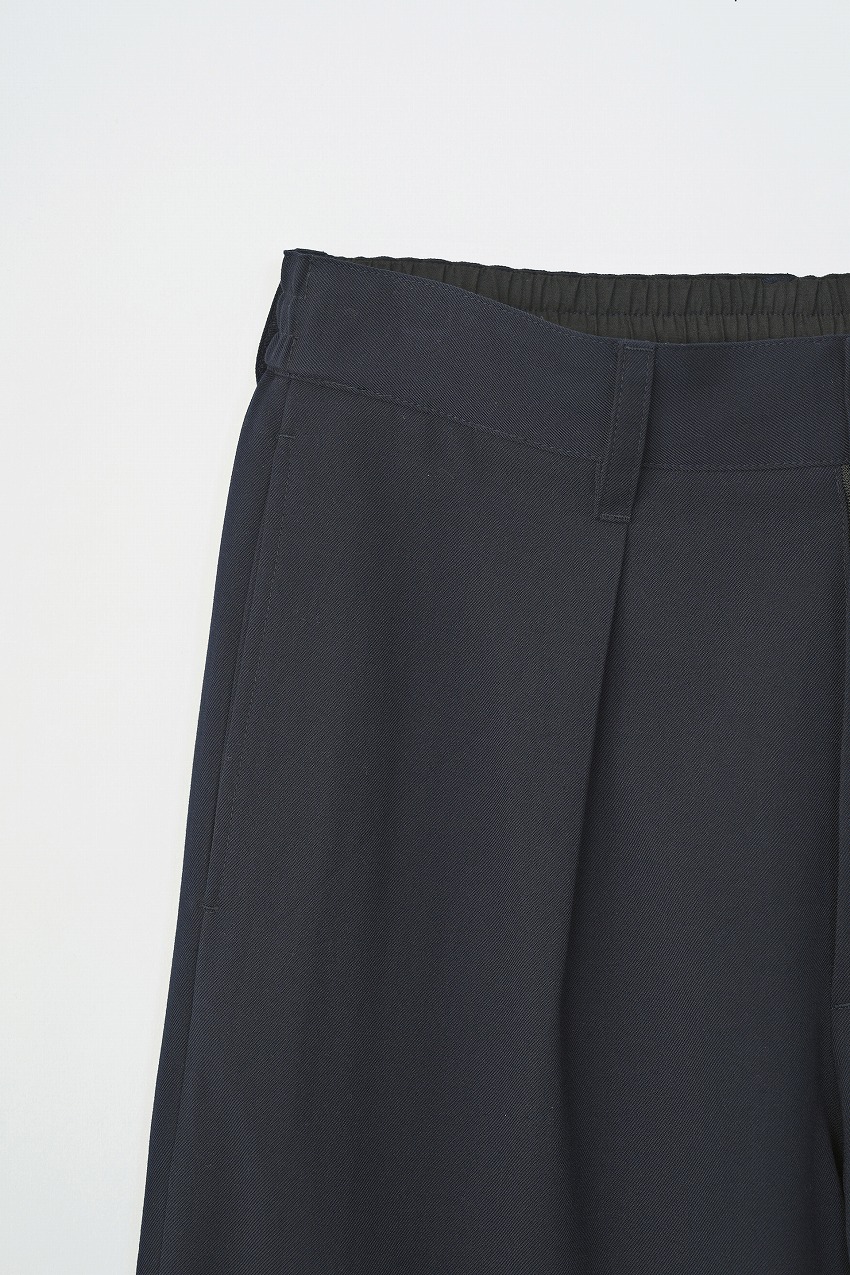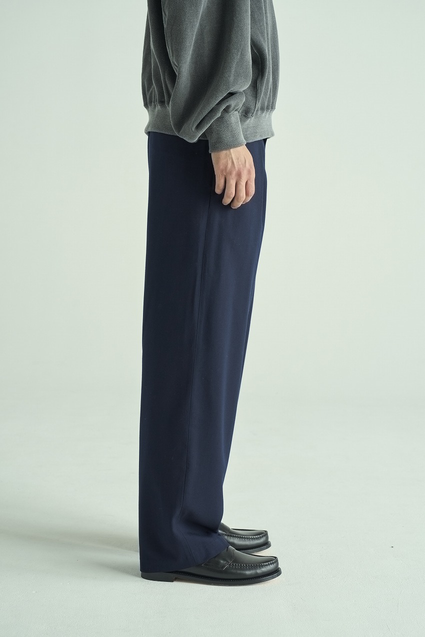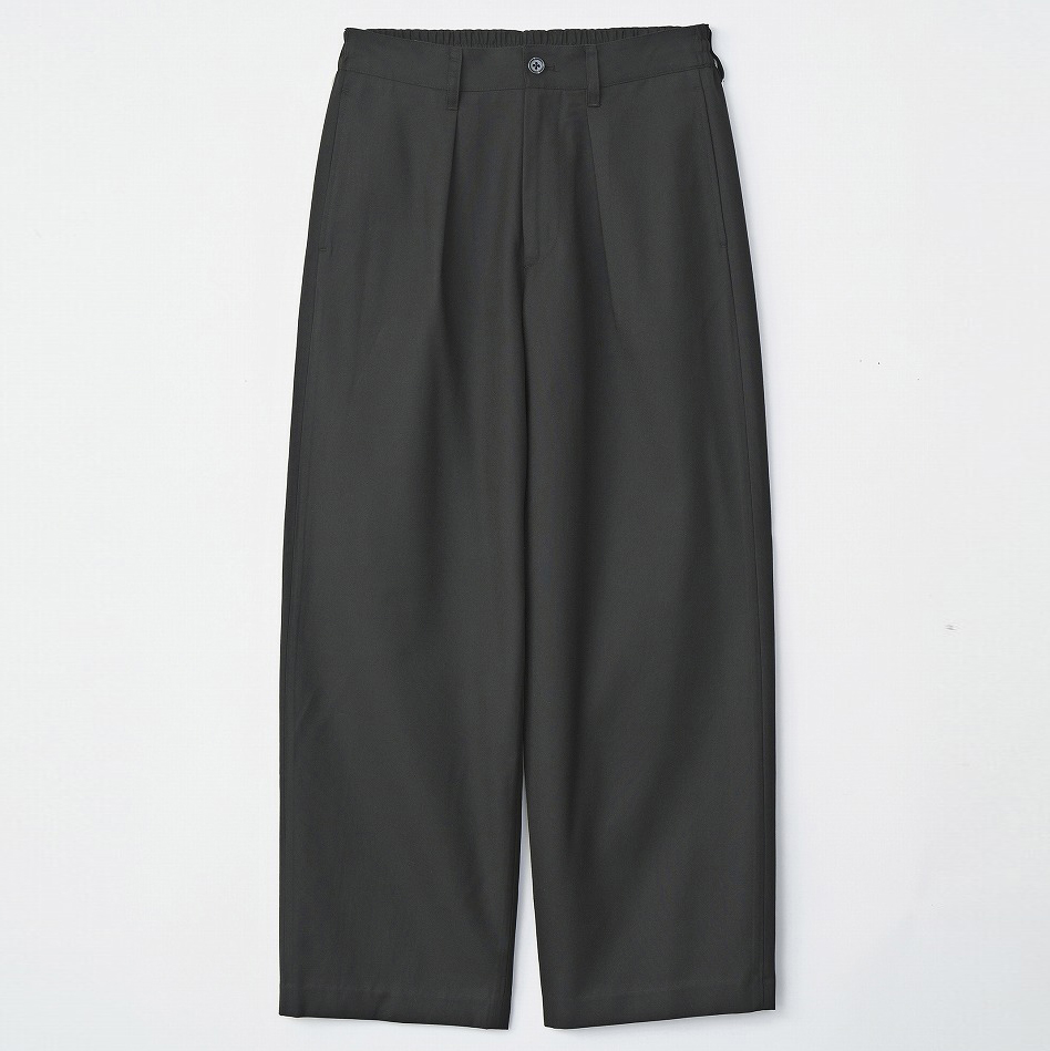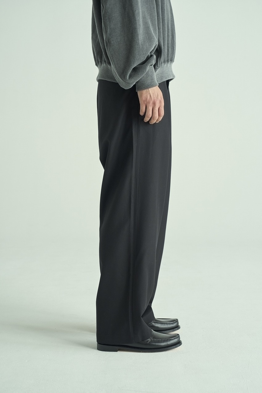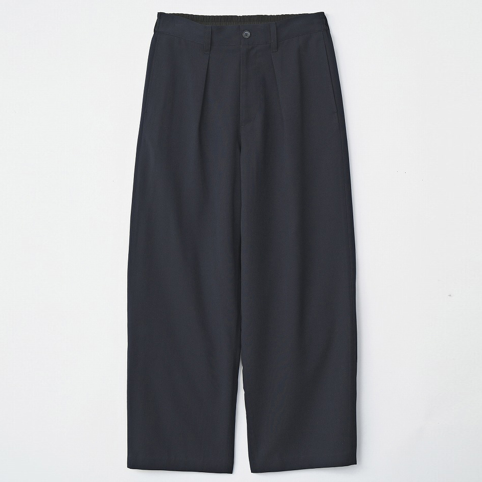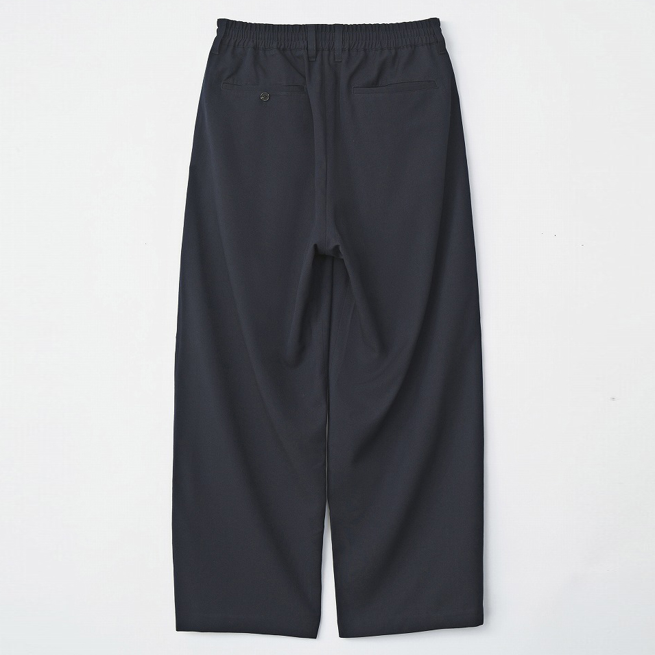 ポリエステルにレーヨンの滑らかさとウールの程よい温かみをブレンドした生地を使用したワイドイージーパンツ。高密度な圧縮フラノ素材により、柔らかな触感を保ちながらもしっかりとした存在感を感じさせます。寒い季節でも心地よい温かさを提供しつつ、軽やかな着心地を保ち、上品で落ち着いた印象を与える一着です。ウエスト部分には背面のみゴム仕様を採用。イージーパンツの快適さを維持しながらも、正面からのすっきりとした印象を実現しています。快適な着心地を兼ね備え、日常使いやカジュアルシーンにぴったりなアイテムです。