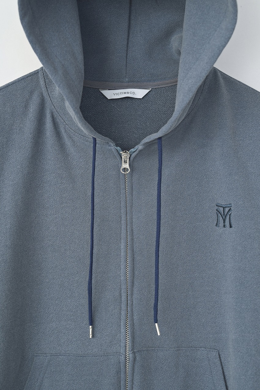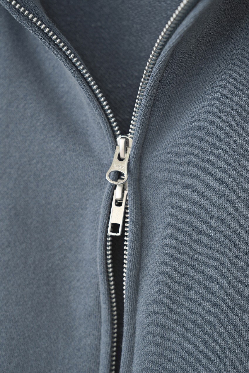 フェード感のある裏毛生地を使用した、ショート丈のジップパーカー。独特の色落ちと風合いを備えた生地は、着込むほどに表情が増し、ヴィンテージライクな佇まいを演出します。身幅にゆとりを持たせたワイドシルエットを採用しつつ、袖丈をやや長めに、着丈をコンパクトに設計。ボリューム感を保ちながらも全体を軽快に見せ、現代的でバランスの取れたシルエットを実現しています。ウエスト位置が高く見える視覚効果により、スタイルアップ効果も期待できます。フロントは逆開のジップアップ仕様で、カジュアルな日常着としてはもちろん、ミニマルかつ洗練された印象で、シーンやスタイルを問わず汎用性の高い一着です。