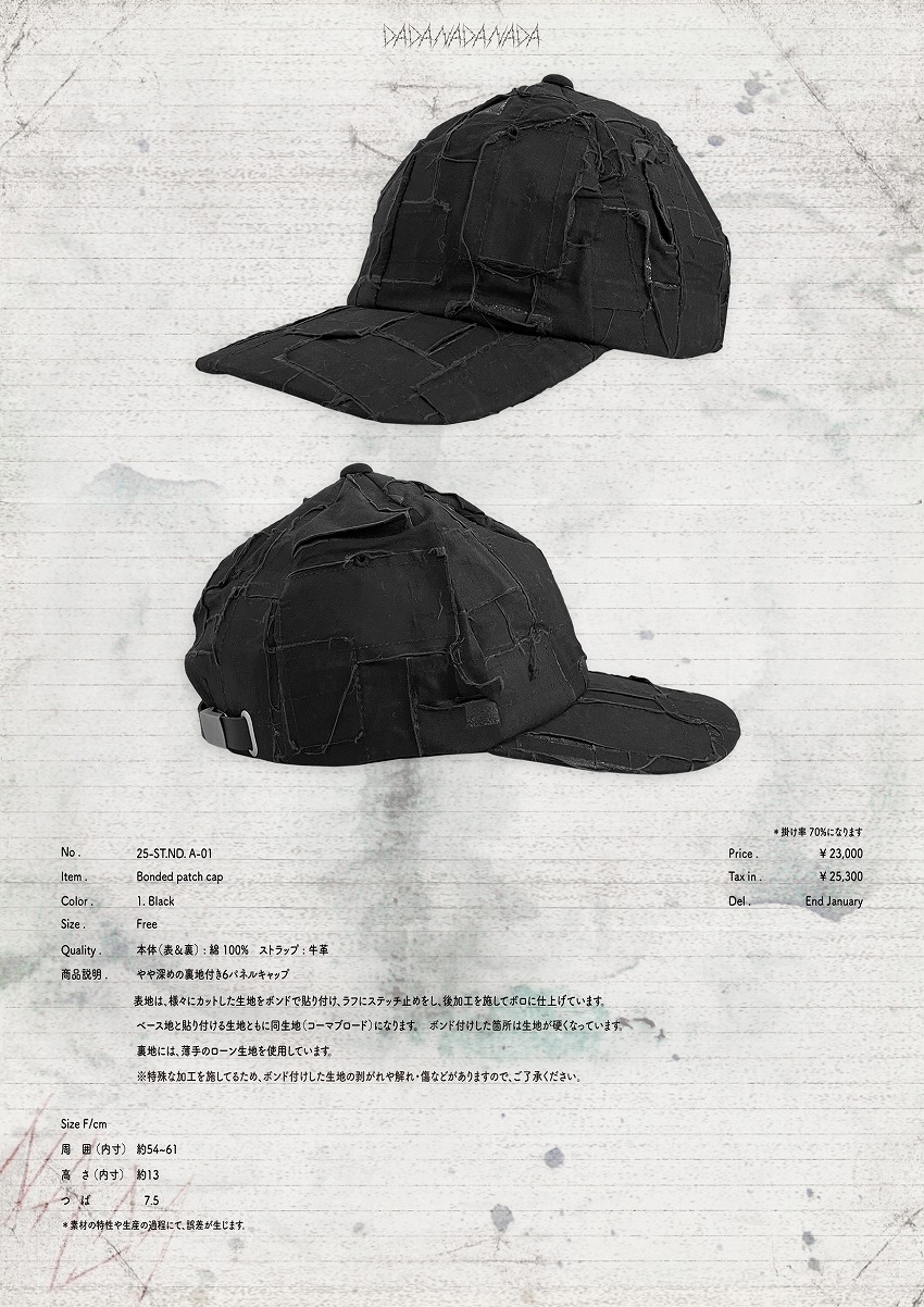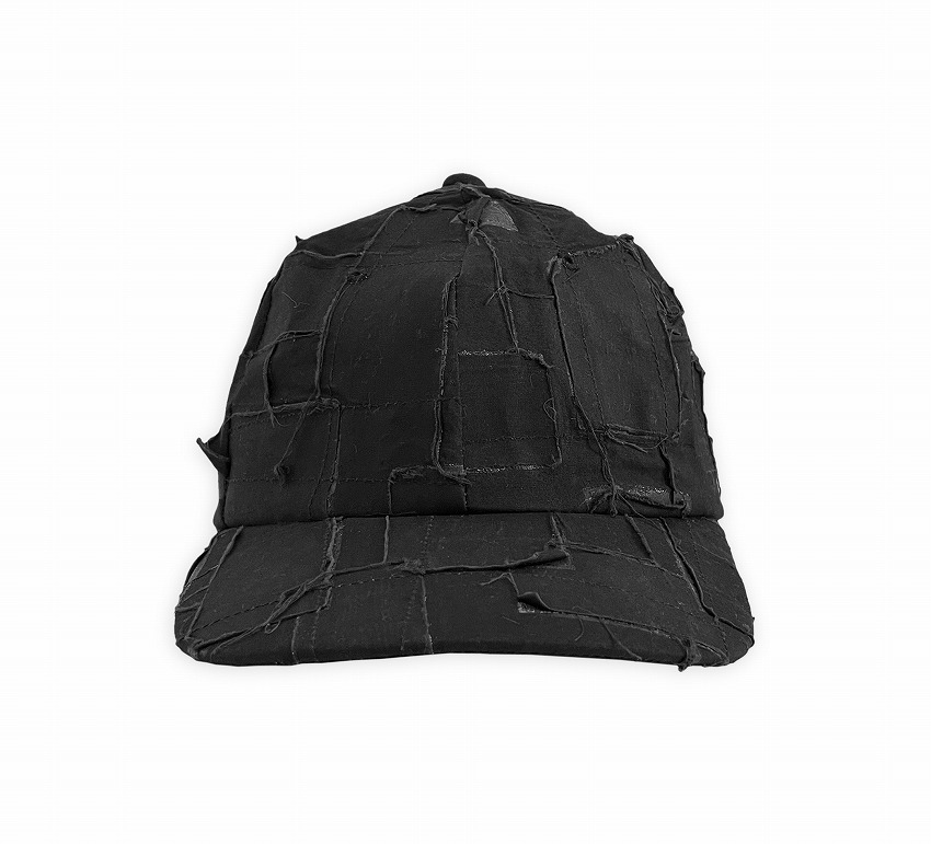 やや深めの裏地付き6パネルキャップ。表地は様々にカットした生地をボンドで貼り付け、ラフにステッチ止めをし、後加工を施してボロに仕上げています。ベース地と貼り付ける生地ともに同生地(コーマブロード)になります。ボンド付けした箇所は生地が硬くなっています。裏地には薄手のローン生地を使用しています。※特殊な加工を施しているためボンド付けした生地の剥がれや解れ、傷などの個体差があります。ご了承ください。