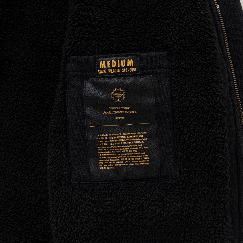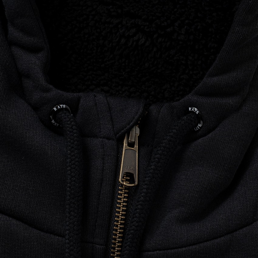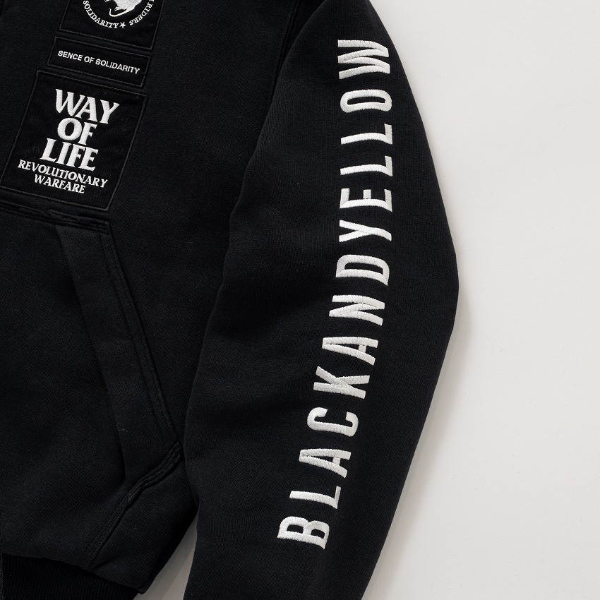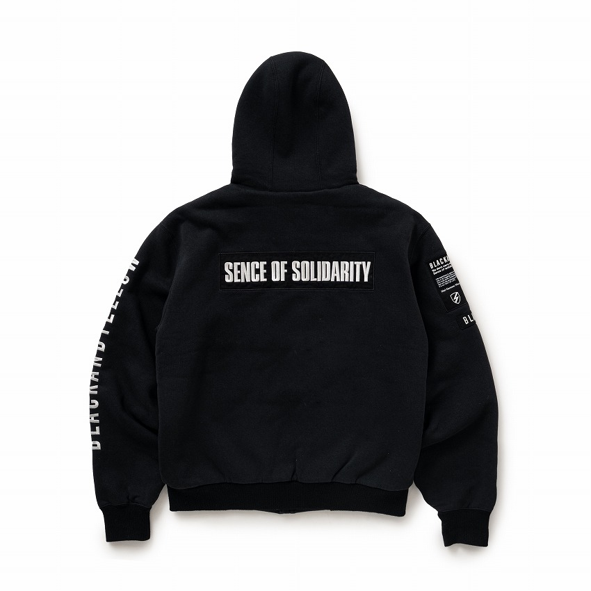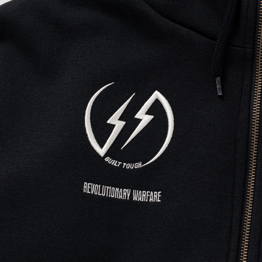 表地に9oz.のコットン/ポリエステル混紡裏起毛素材を使用し、身頃裏地に肌触りの良い滑らかな質感のポリエステル素材のフリース生地、スリーブ裏地に薄手の中綿入りキルティング生地を使用した、ジップアップフーディー。左胸に刺繍ロゴワッペン、右胸に3D刺繍、右袖にプリントワッペン・コットンヘリンボーンテープワッペン、左袖にダイレクト振り刺繍、後ろ身頃に刺繍ロゴワッペンをあしらった、高インパクトのデザイン。前身頃のフラップ付きマフポケットはトリプルニードル仕上げ、内ポケット、首元にオリジナルのロゴ入りアイレット、スピンドルループ付き。ややゆとりのあるシルエット。