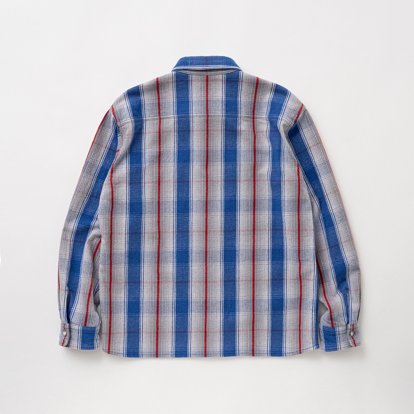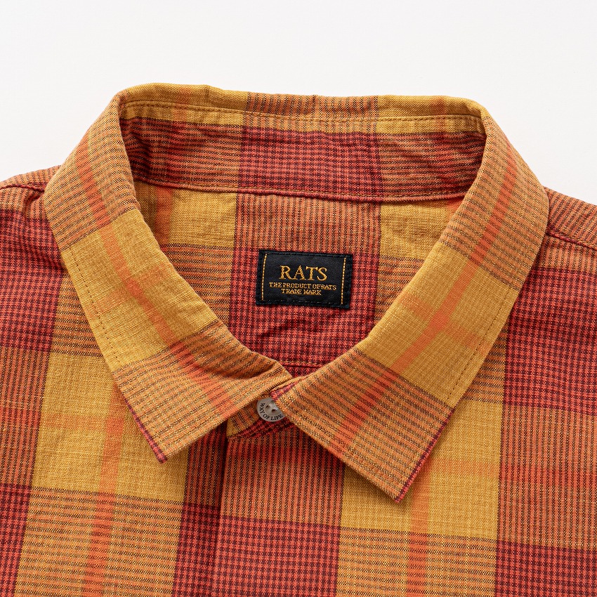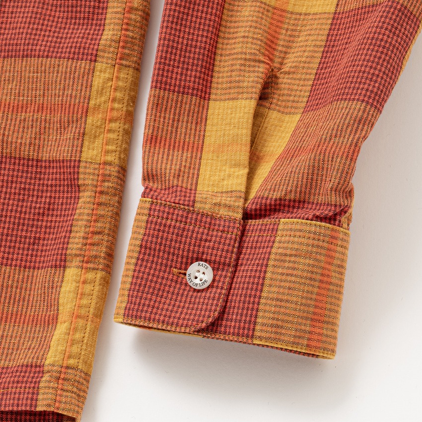 オリジナルのコットン先染め素材を使用したレギュラーカラーチェックシャツ。ポケット・脇下も柄合わせを行った手の込んだ仕上がり。左胸にパッチポケット、ポケット脇にピスネームを挟み込み。袖仕様はいってこい始末、襟は小ぶりなレギュラーカラーの台襟仕立て、ボタンパーツはすべて“RATS”・“WAY OF LIFE”の刻印入りのオリジナル。クラシックなワークシャツに見られるボックスシルエット。