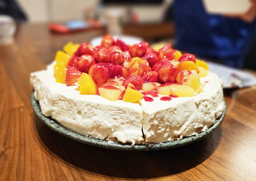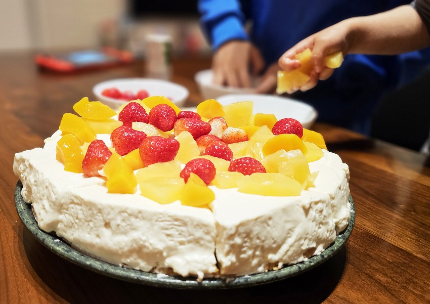 こどもたちはチーズケーキにフルーツカスタム。