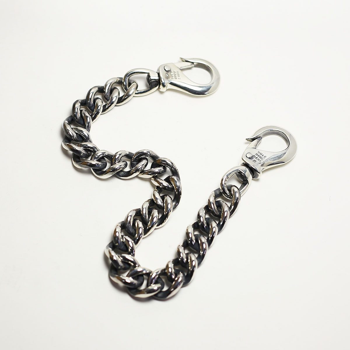 フックが特徴的でさらに程よい重量感が不変のアイテムのウォレットチェーン。名前やメッセージが刻印で入り、誕生石まで入る自分だけの世界に一つのアイテムです。
